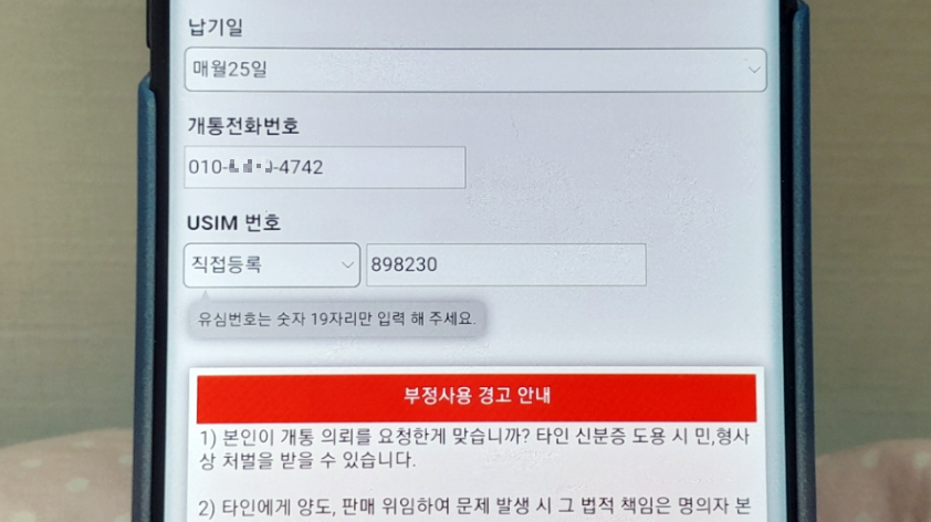 미리 구입한 유심 번호를 입력합니다.