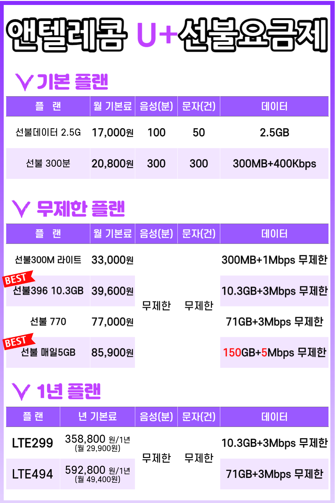 일반적으로 제일 많이 선택하는 요금은 LTE 396 요금제 입니다.