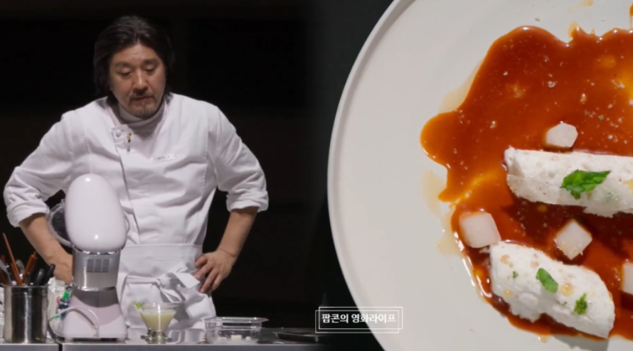 이균은 한국에서 밥을 먹을때는 항상 많이 주어서 음식을 조금 남겼다고 하면서 그것이 한국 음식의 특징이라고 밝히며 그 특성을 착안해서 떡 3개를 고추장 소스와 합친 요리를 내었던 것입니다.