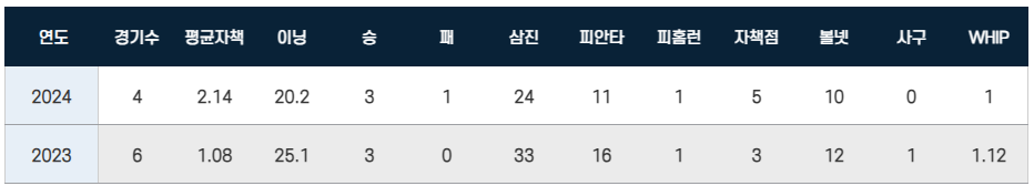 2024년에는 평균자책점이 2.14로 많이 뛰었으나 그 역시 엄청난 성적입니다.