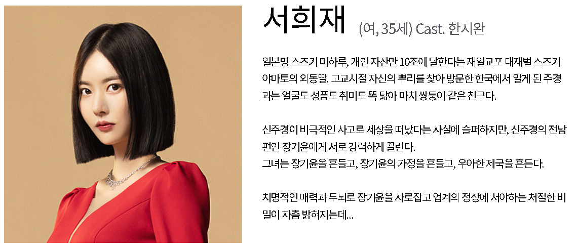 한지완은 서희재와 신주경 1인 2역을 맡아 주인공으로 연기 합니다.