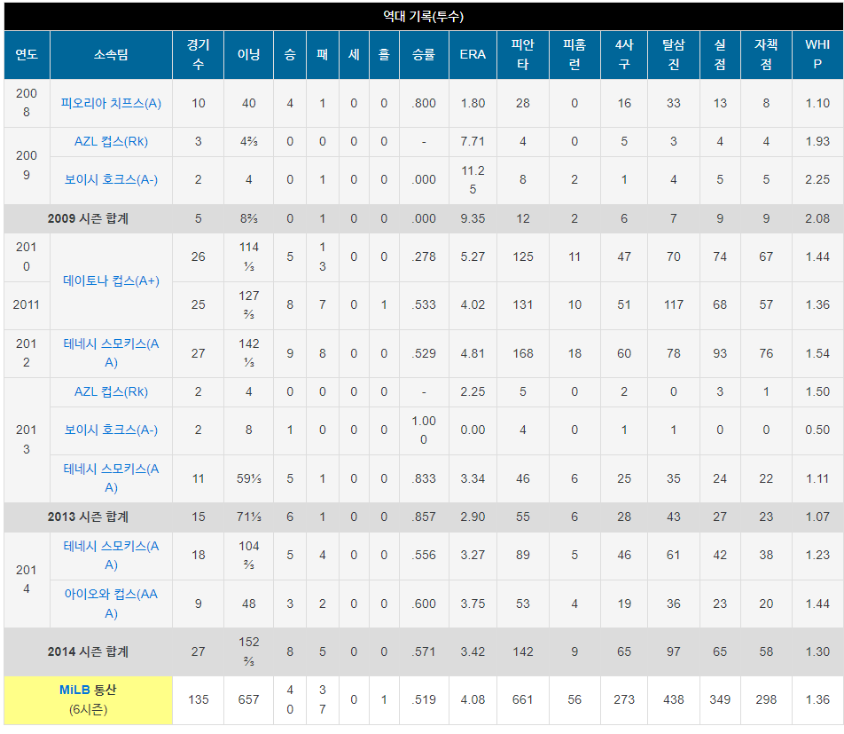 아쉬운 마이너리그 통산성적으로 135경기, 121선발, 40승 37패, 방어율은 4.08 입니다.
