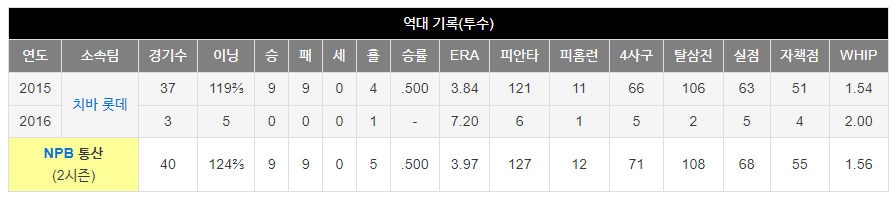 2015년에는 일본프로야구 퍼시픽리그에 치바 롯데 마린즈와 계약하면서 바로 선발투수로 데뷔를 합니다.