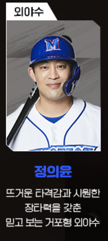 정의윤은 통산홈런이 119개로 거포의 기질을 가지고 있으며, KBO 리그에서 4번을 치던 거포 입니다.