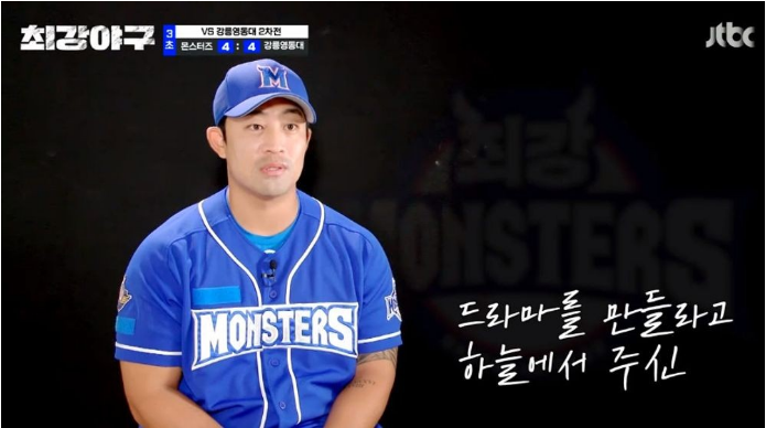 최강 몬스터즈가 0대4로 뒤지고 있는 시점인 3회초에 정의윤의 최강야구 첫 홈런이 나옵니다. 그것도 만루홈런!