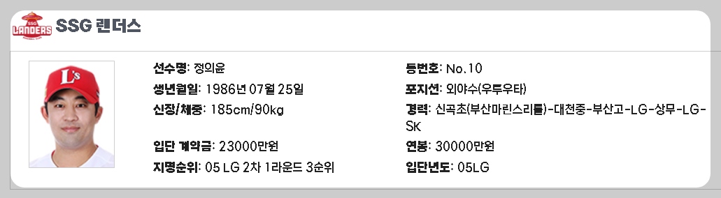 최강야구에서 패션근육을 담당하는 정의윤, 일명 정의용 선수가 야구를 좀 했던 선수인지? 아니면 그저그런 성적을 남긴 선수인지 알아 보겠습니다.