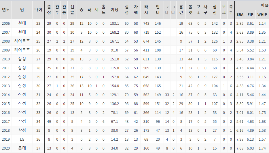 프로에서만 정규시즌 15시진을 보낸 통산 121승의 레전드 투수 입니다.
