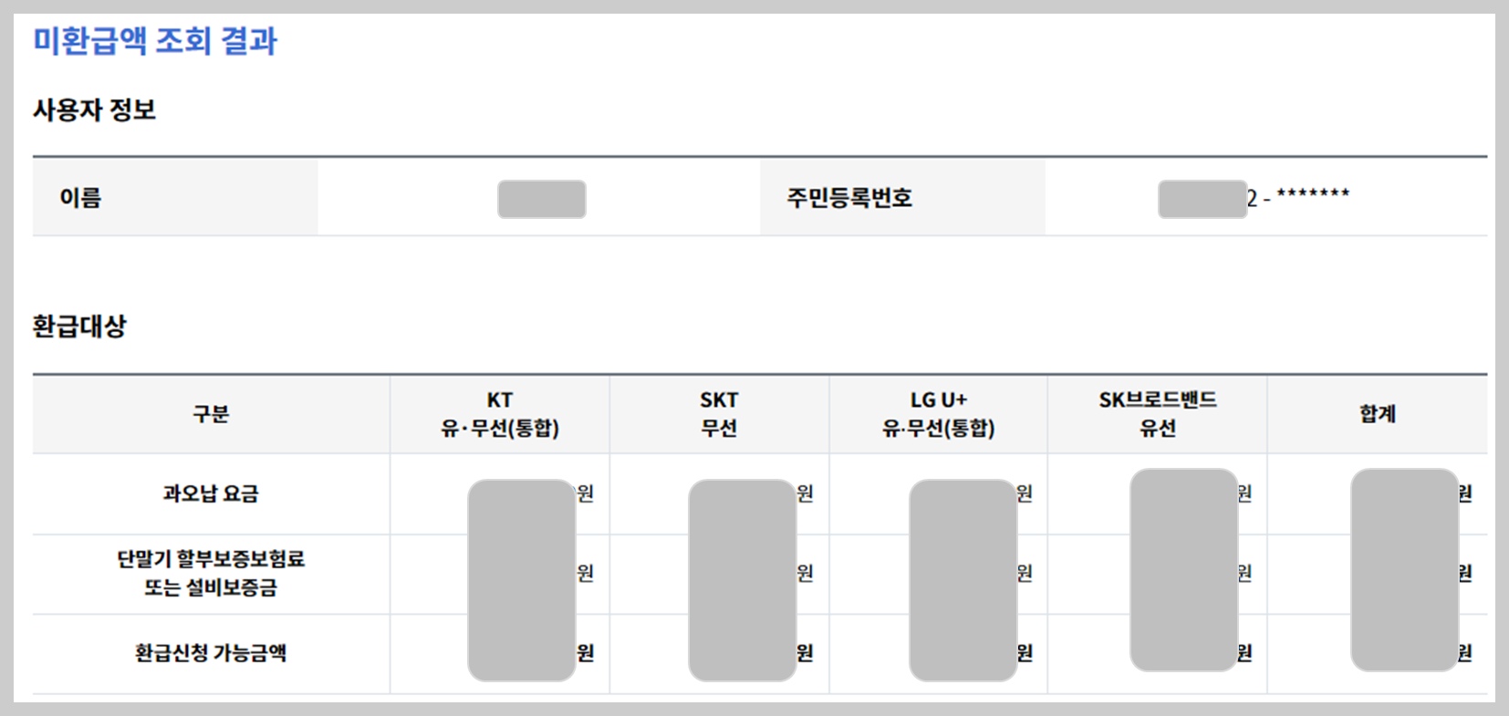 ③ 통신 미환급금 조회 결과