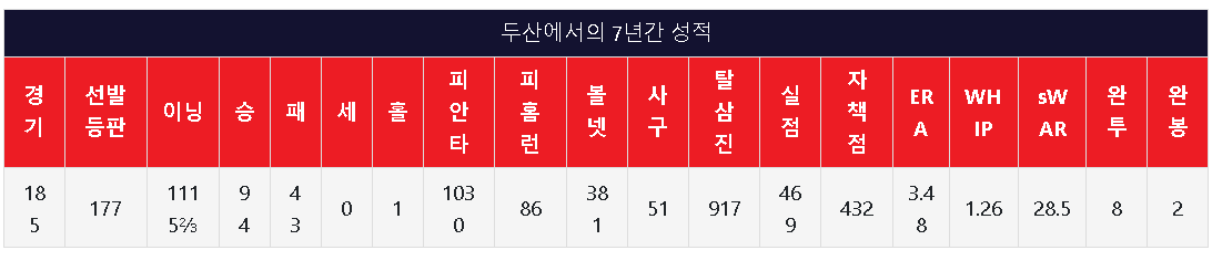 니퍼트가 두산베어스에서 이룬 성적은 대단하다는 말밖에 나오지 않을 성적 입니다.