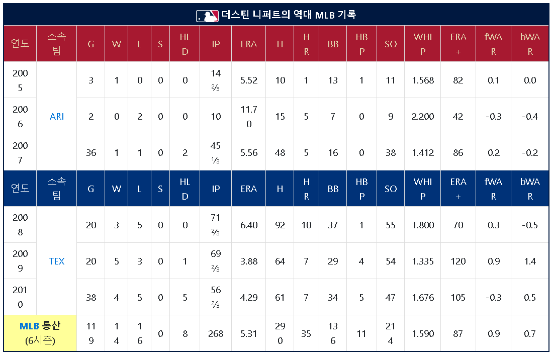 니퍼트는 캐리어 전체를 통틀어 MLB 성적은 14승 16패 방어율 5.31에 WAR 0.7을 남겼습니다.
